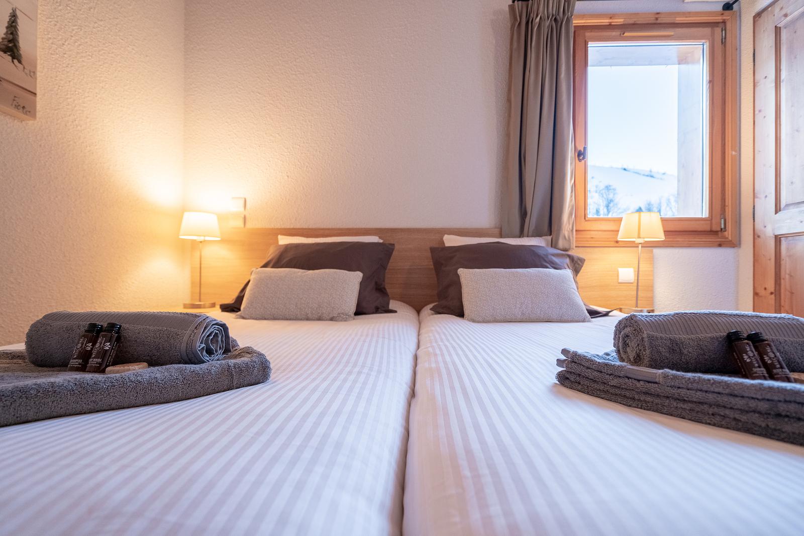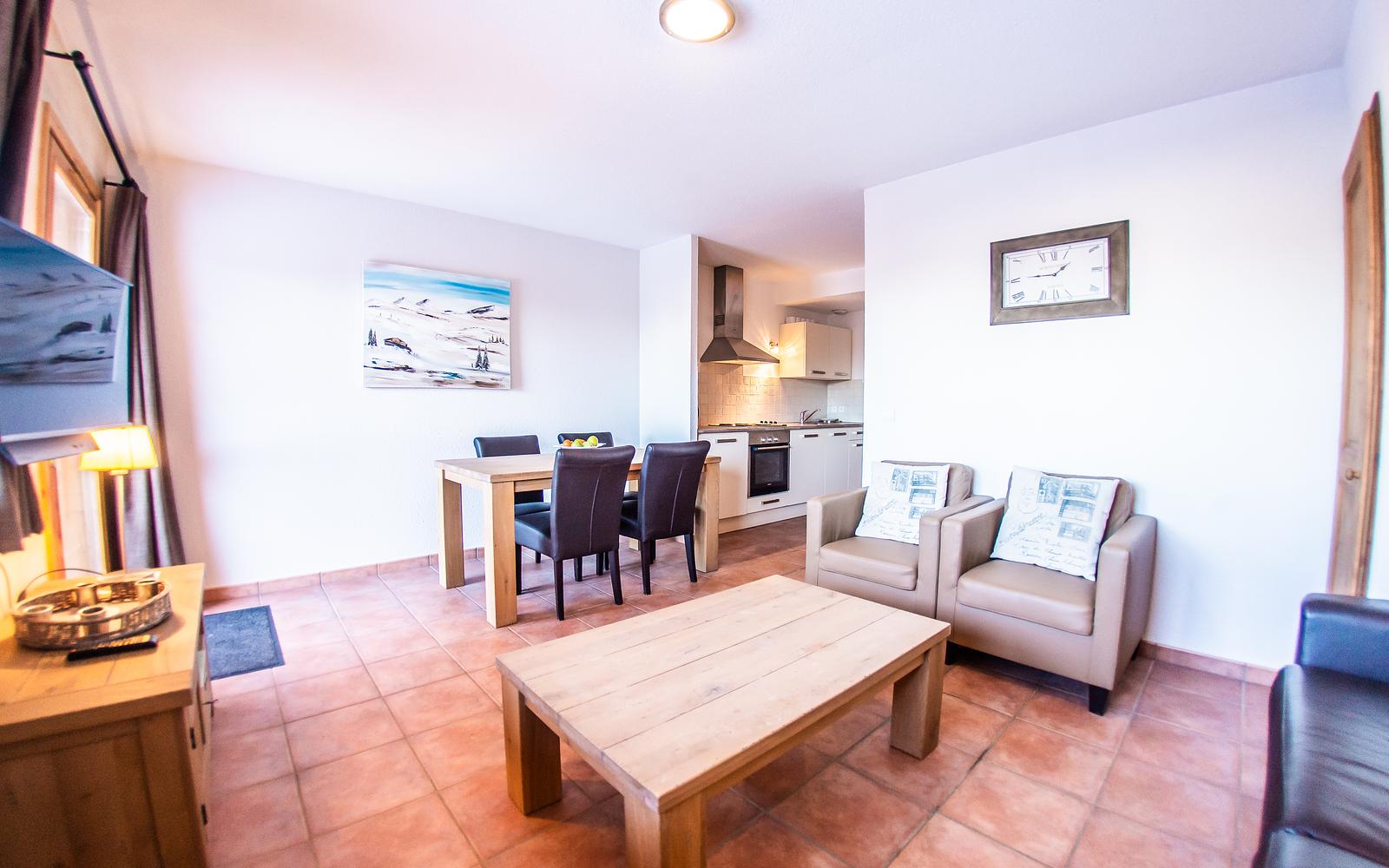 De 4-persoons appartementen beschikken over een slaapkamer met boxspring bedden. In de woonkamer is een comfortabele slaapbank die geschikt is als slaapplaats voor 2 personen. Uiteraard is een televisietoestel aanwezig met diverse zenders via de satelliet. De badkamer beschikt over een ligbad of douche en separaat treft u een toilet aan. De keuken is van alle gemakken voorzien zoals een oven, magnetron, vaatwasser, koelkast met diepvriesvak en 4-pits elektrische kookplaat. In de woonkamer kunt u genieten van het uitzicht en loopt u zo uw zeer grote uw terras of balkon op. In het centrale gebouw is een aparte plaats om uw ski’s veilig op te bergen.